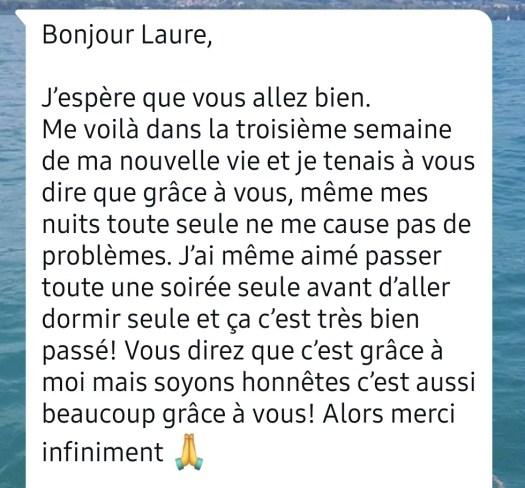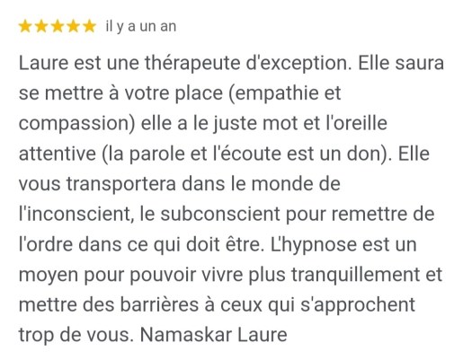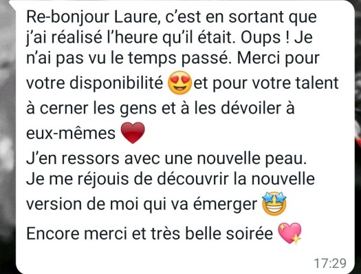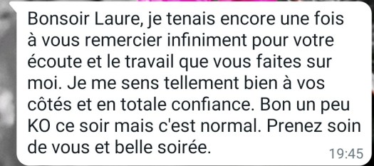 NOUVEAU: Accompagnement thérapeutique (sans hypnose) Parfois, nous avons simplement besoin d’un lieu sécurisé où il est possible de déposer le trop-plein de notre quotidien tout en bénéficiant d’un regard neutre, extérieur et habitué à comprendre pour mieux avancer. Forte de ma longue expérience et habituée aux outils tels que, entre autres, la PNL ou « l’hypnose conversationnelle », je sais écouter pour comprendre, mettre des mots sur des ressentis souvent un peu flous et offrir une autre vision sur les difficultés de la vie. Parce qu’il n’y a pas nécessairement besoin d’hypnose pour retrouver confiance en soi, en la vie, en ce que nous vivons!
