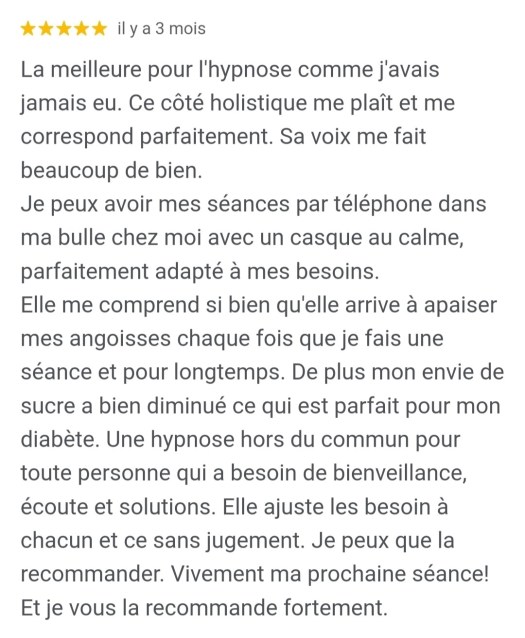 À mes yeux, tout problème peut donc être abordé. Par conséquent, mon approche de l’hypnose et de la thérapie est vaste et les résultats obtenus jusqu’ici démontrent clairement que tout est possible du moment où l’on se donne les moyens de l’obtenir.